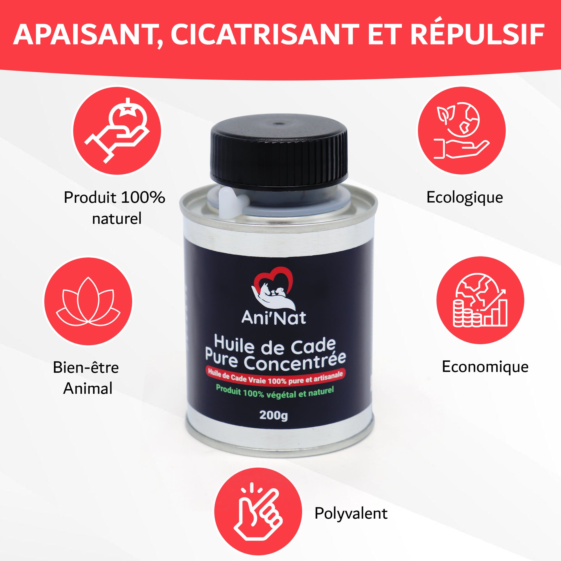 L'huile de Cade a de nombreuses vertus : purifiante, anti-inflammatoire, cicatrisante, apaisante, répulsive, anti-parasitaire.